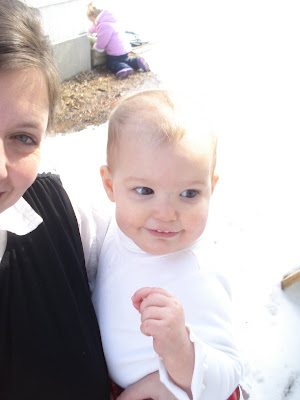 This is a pretty bad picture (I'm cut off, it's sooo white, etc...) but for some reason I really like it! I think it might be the one little patch of dead grass that Ella's in that I'm enjoying. We haven't seen the earth for a long time and that little patch (which is mostly mud right now and yes, Ella was covered in it) gives me hope! Kate was so happy happy to be out of her big furry snow suit. Poor baby. She doesn't even remember life without that thing.